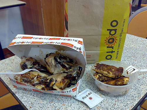 吃完就到處去晃晃啦~ 發現我三年前來最愛的那家紀念品店倒了~真可惜~它最便宜說~ 還晃了晃特價書店~好多便宜的書真想買~晃到六點店都關了~打電話給leon他說還在趕作業要晚一點才能走~ 看了看四周只剩速食店跟一家星巴克還有開~於是就到starbucks點了一杯decaf grade latte坐下來休息邊看路人~呼~還是starbucks的咖啡好喝順口~grade size的比前幾天在UQ那間的大杯~也不過$4.05~隔壁休閒小站也要差不多價錢咧~在這邊starbucks真的不算高消費了耶~ 等到後來開始玩起我的貪食蛇~玩到第10關了leon才終於出現~ 晚上就去旁邊的oporto吃烤雞~看起來黑嗎嗎的~不過滿好吃的喔~ leon吃烤半雞~選了檸檬口味的醬~約$8~ 我的是烤雞柳條一份四條約$6~吃完就坐公車回家啦~